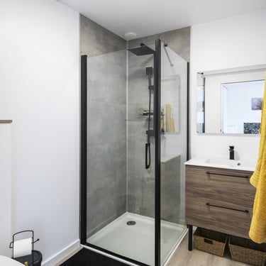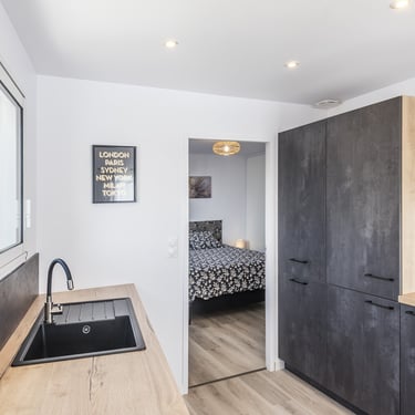 Contexte > dans le cadre de la création d'un gîte destiné à la location courte durée, l'enjeu était de concevoir un espace polyvalent et pérenne — fonctionnel et séduisant pour des locataires variés aujourd'hui, mais également pensé pour accueillir des membres de la famille y compris des aînés en perte d'autonomie à terme. Chaque choix — circulation, mobilier, salle d'eau — a été réfléchi pour répondre à ces deux usages dans le temps.